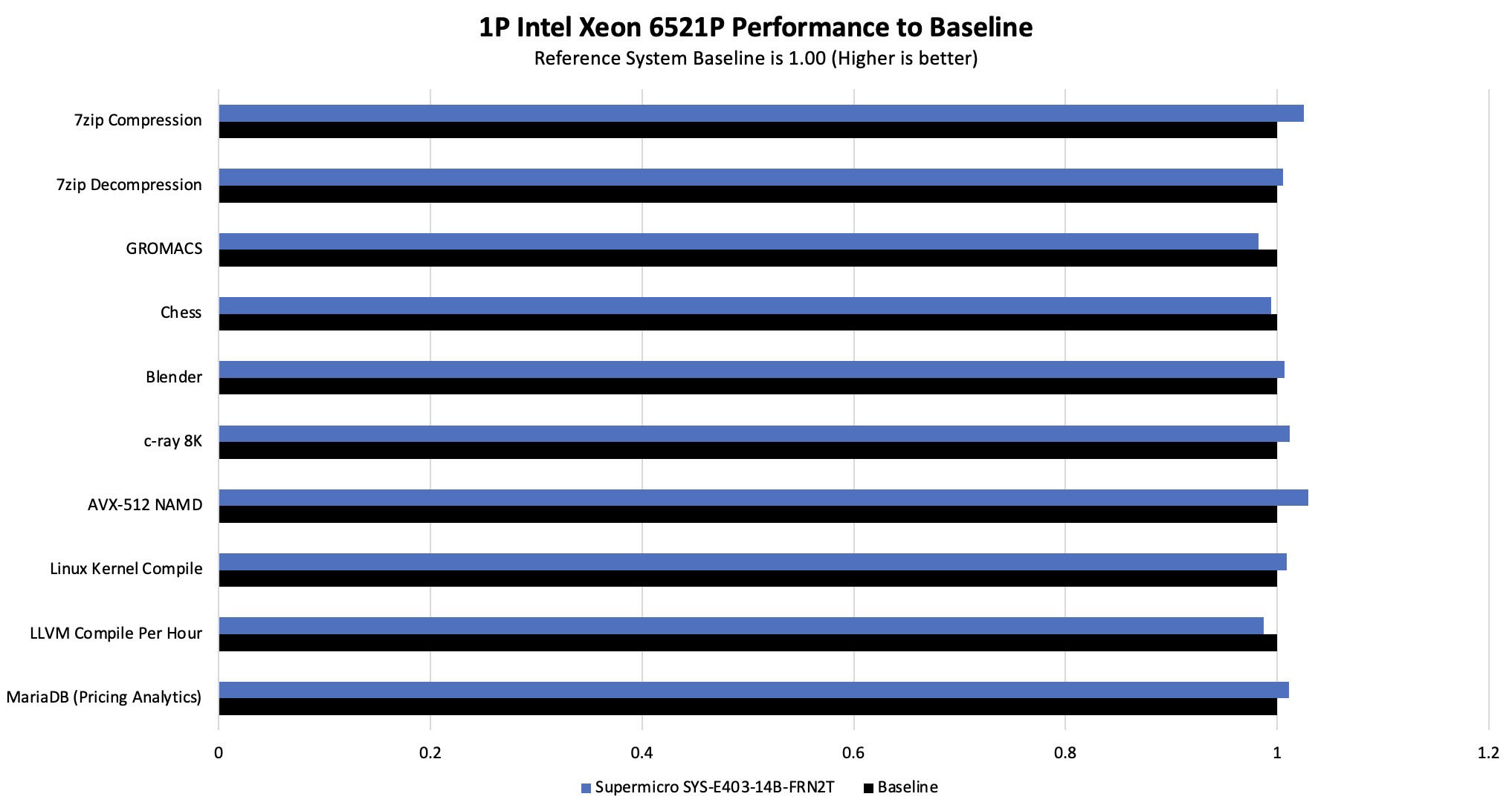 It should be noted that the Xeon 6521P has a TDP of 225W, while the SYS-E403-14B-FRN2T’s cooling capacity is capped at 300W, leaving ample headroom between the two. Under sustained load, the processor frequency and performance output remain stable.