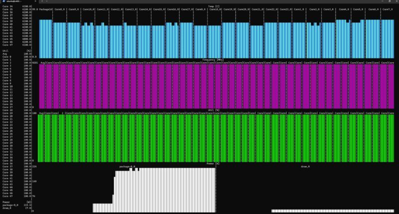 Under full processor load, the CPU package power consumption is approximately 225W, and the overall system power consumption varies significantly with the load. Actual measurements show that the system idle power consumption is below 200W, while under full load it approaches 400W.