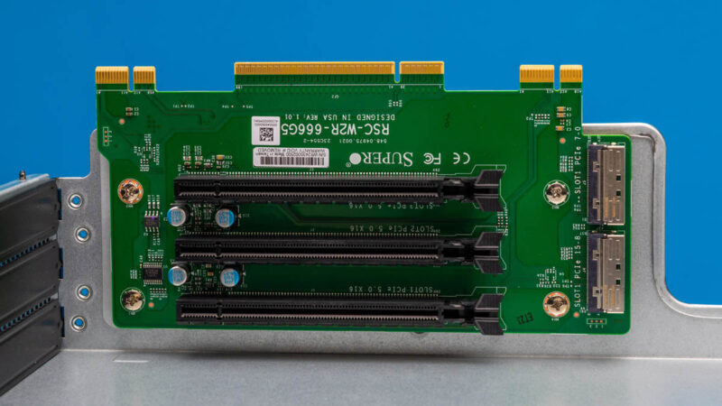 At the edge of the chassis and in the PCIe adapter area, there is a small clip structure for securing and releasing the adapter board. This adapter board houses three PCIe 5.0 x16 slots . To provide sufficient bandwidth for these slots, the motherboard connects to the adapter card via two MCIO x8 interfaces, enabling PCIe lane expansion.